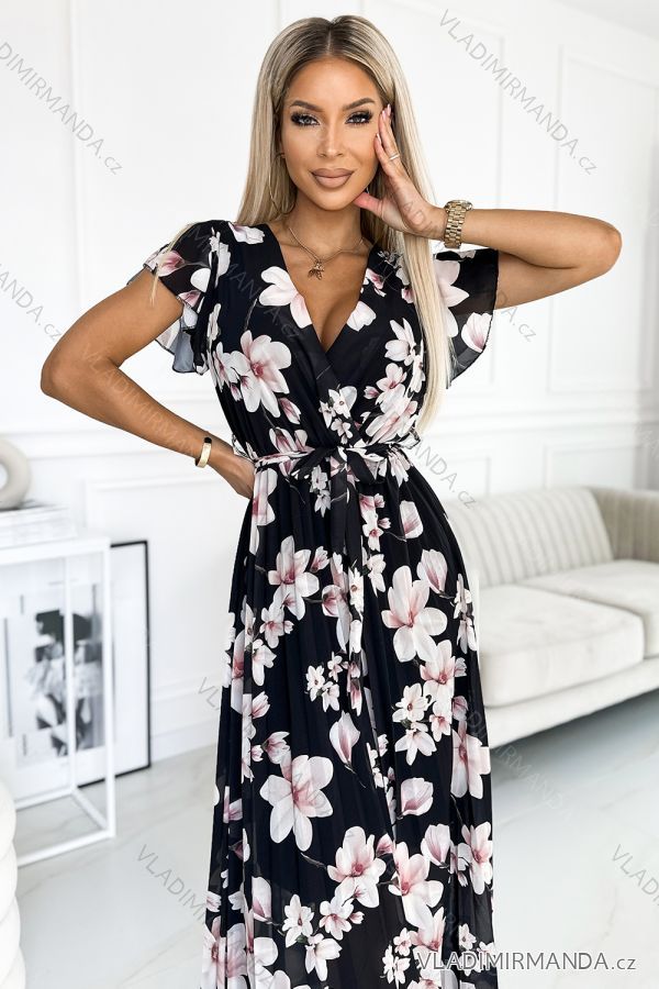 Lisa - chiffon midi dress with a neckline and frills on the shoulders. Pattern: peach blossom on a black background. Numoco brand. European production.