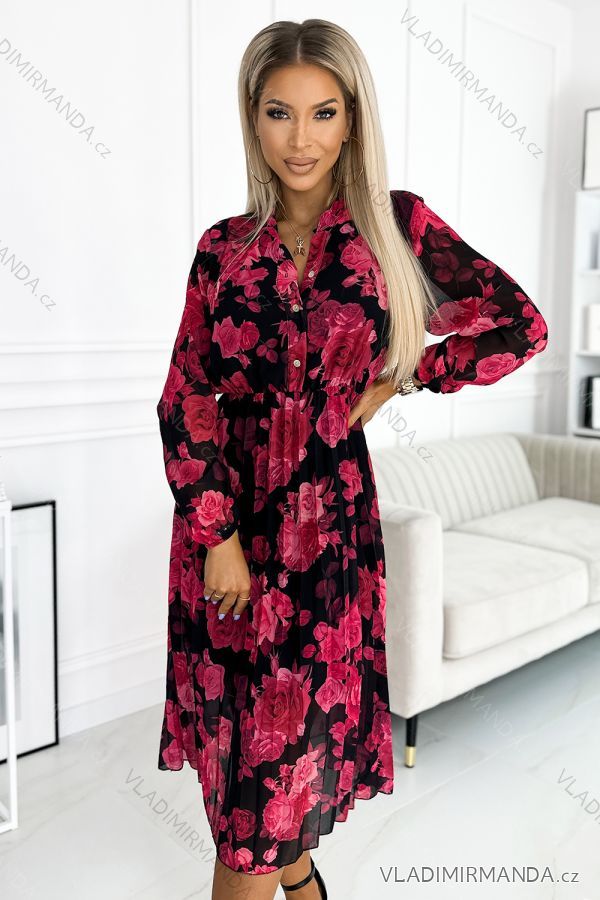 ZBOŽÍ (119972) > Oblečení dámské (81272) > Šaty (30587) > 449-2 CARLA Plisované midi šaty na knoflíky a dlouhý rukáv - černé s červenými růžemi