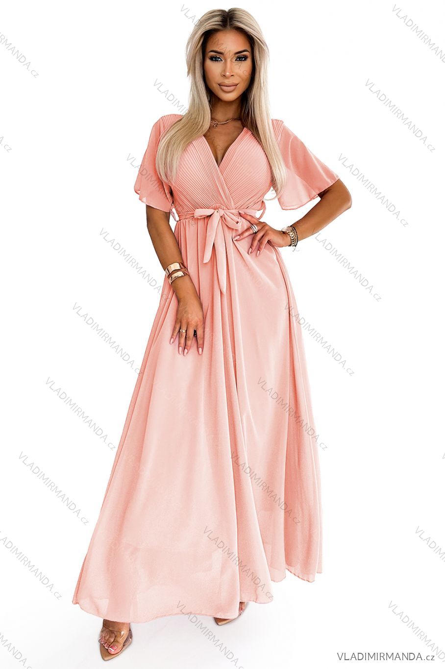 Elegantes pfirsichfarbenes Maxikleid mit Umschlagausschnitt, luftigen Ärmeln und Taillenbändern. Luftig, feminin und perfekt für Hochzeiten, Kommunionen oder Partys. Marke: Numoco Basic | Europäisches Produkt