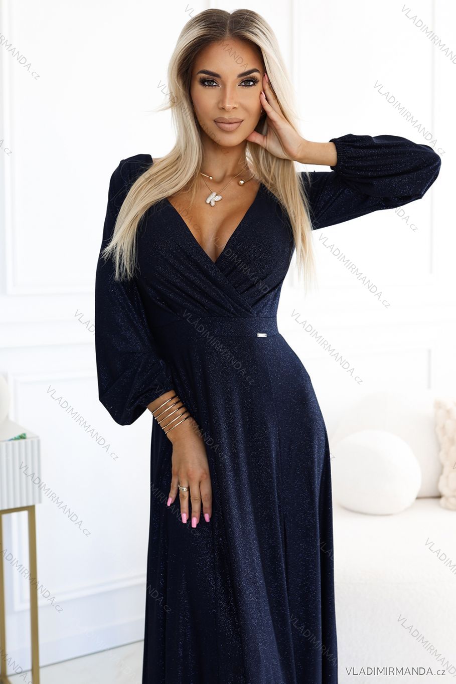 572-1 NELA lesklé dlouhé šaty s výstřihem a dlouhými rukávy - tmavě modrá