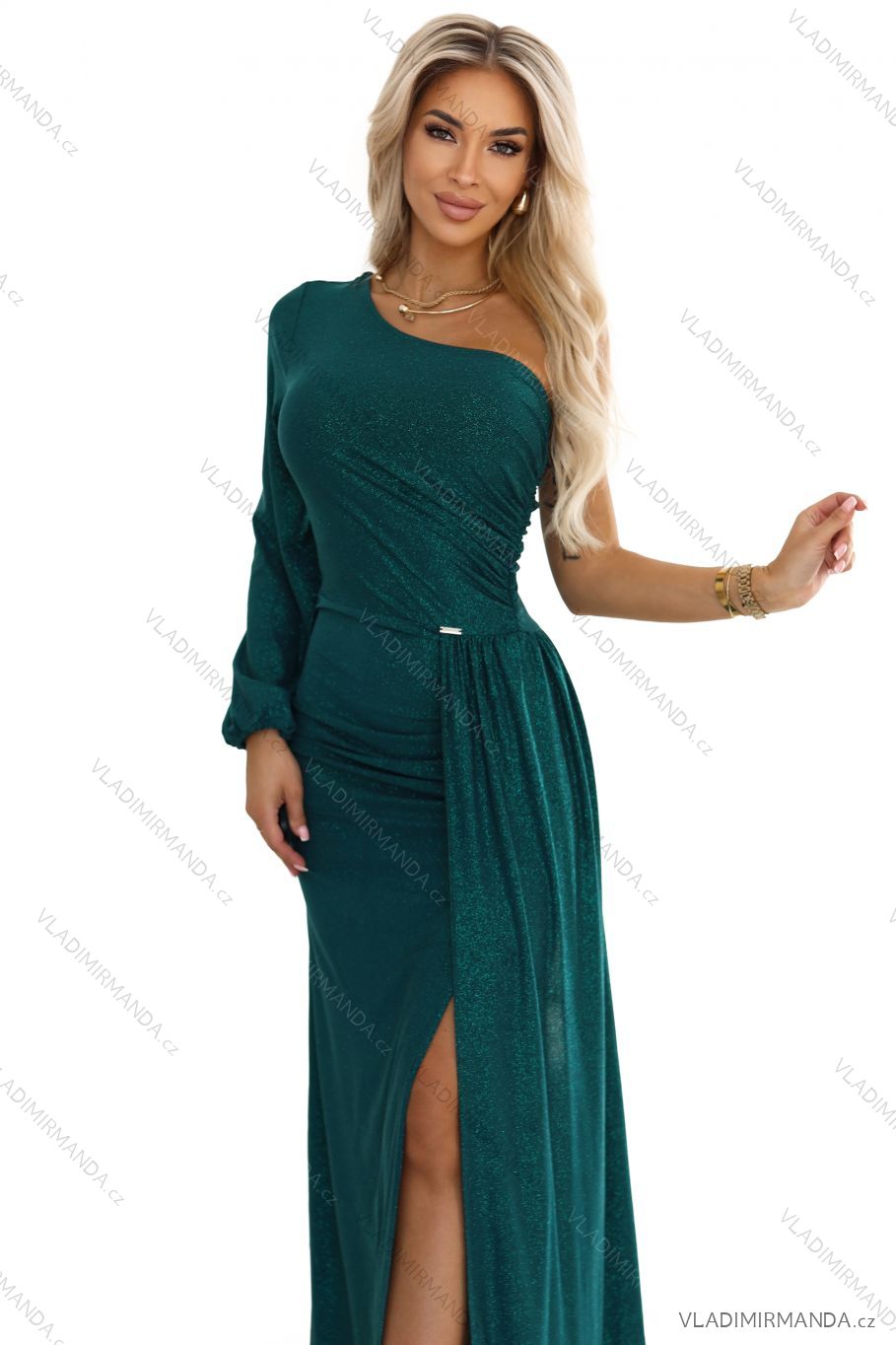 658-2 Glitzerndes, schulterfreies Maxikleid mit asymmetrischen Ärmeln und Schlitz – Flaschengrün