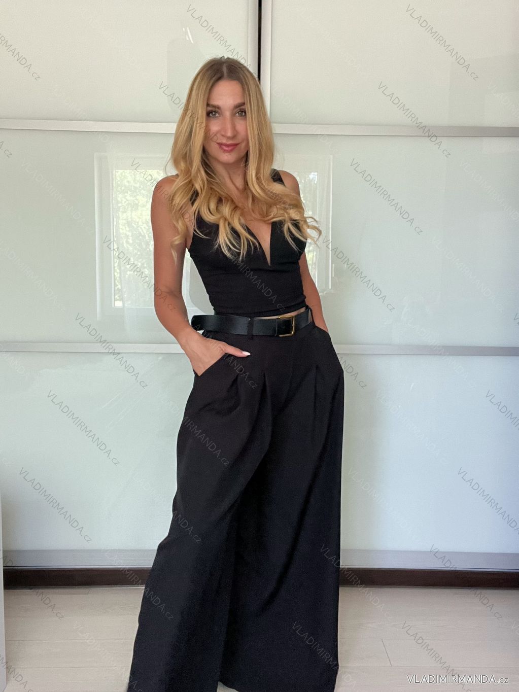 Dlhé nohavice so širokými nohavicami a pásikom