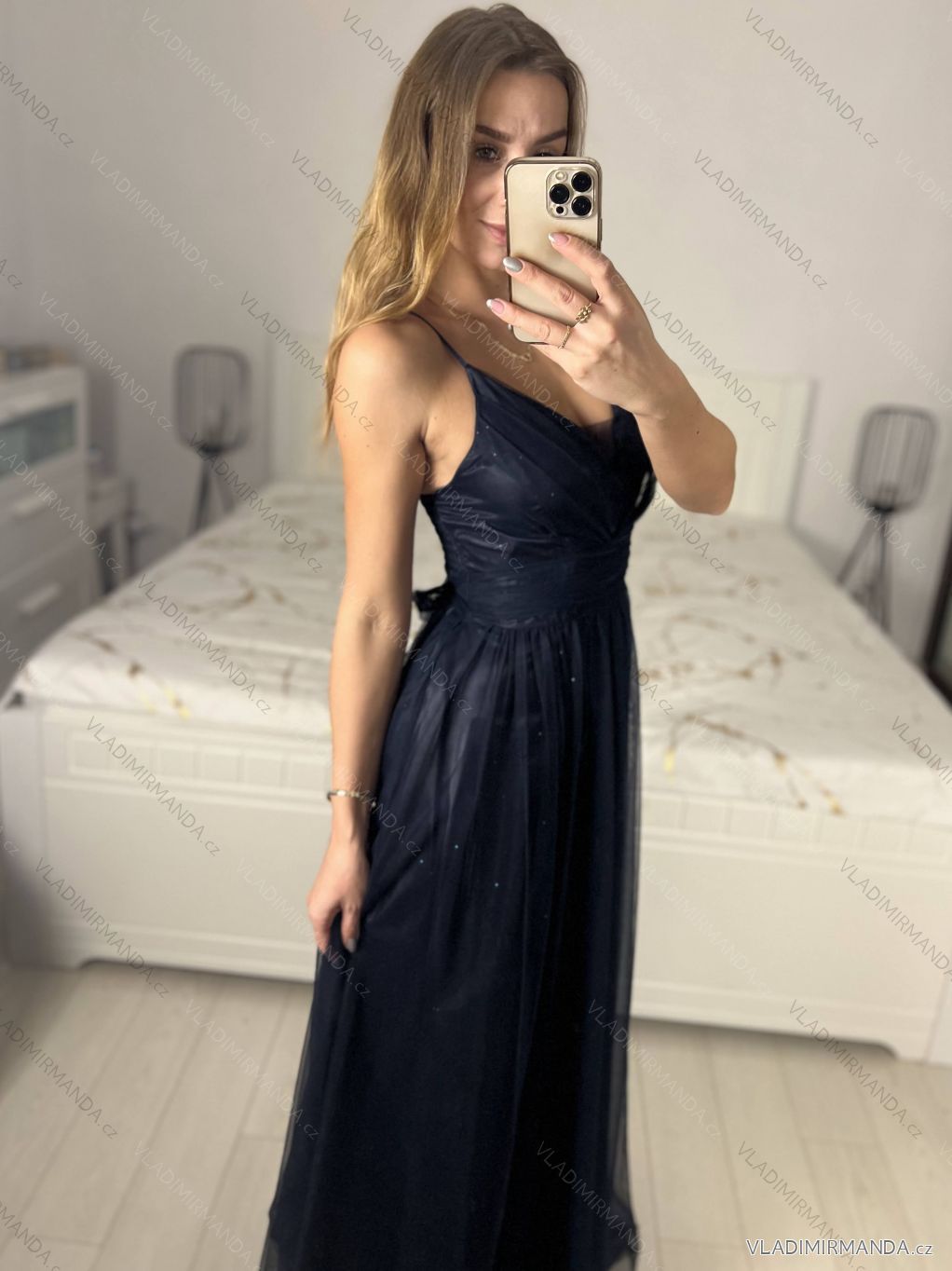 Dlouhé společenské šaty se žabičkováním na zádech, nastavitelná ramínka.