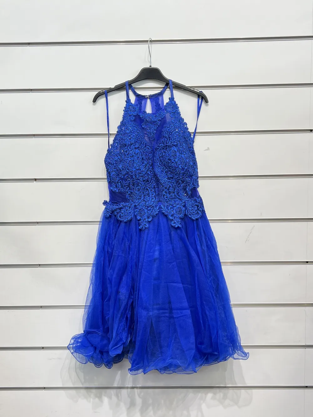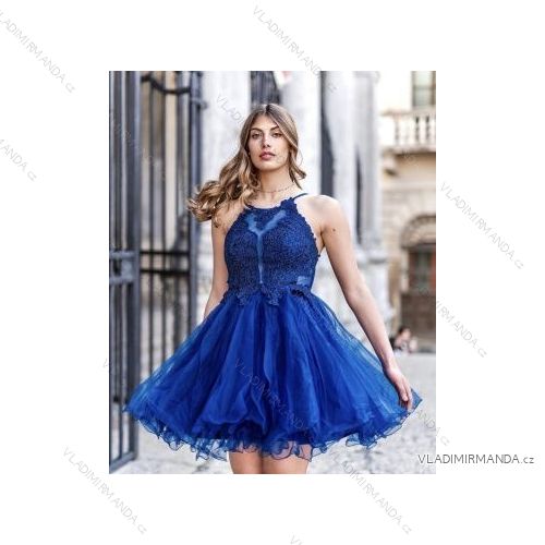 Krátké plesové šaty s krajkou zdobenou kamínky a tylovou sukní. Šaty mají všitou podprsenku, žabičkování na zádech a zapínání na boku na zip