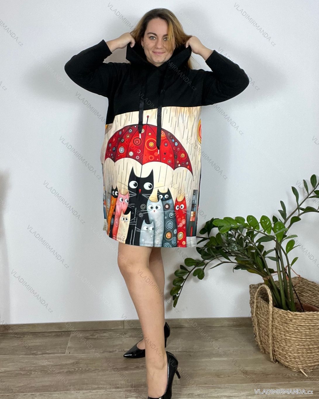 Šaty mikinové s kapucí obrázkové dlouhý rukáv dámské nadrozměr (54/56/58 ONE SIZE) ITALSKÁ MÓDA IM424793-2/DR 56/58 Černá