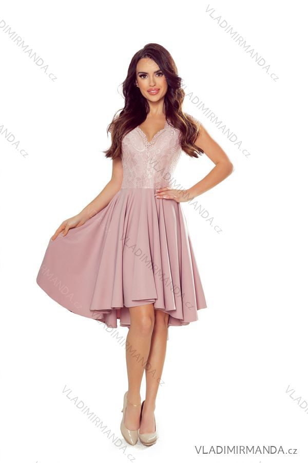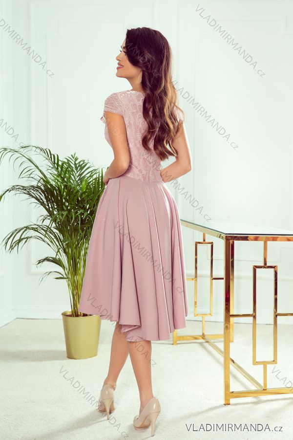 Patricia - exclusive asymmetrical dress with long back, short sleeves, neckline and lace - powder pink color. A skirt with longer back will be perfect for dancing. Polish production. Numoco brand. Dress Patricia - powder pink color The dimensions are measured on a flat - without stretching the material (+/- 2 cm) The woman in the photo is 171cm tall. Size S. Sizes: