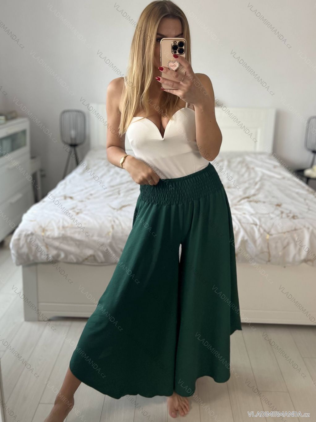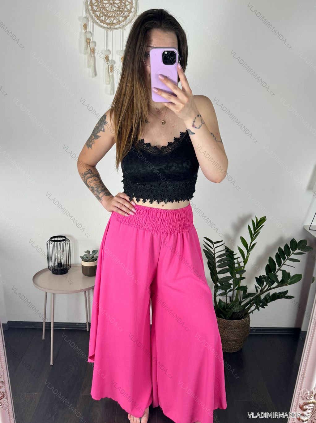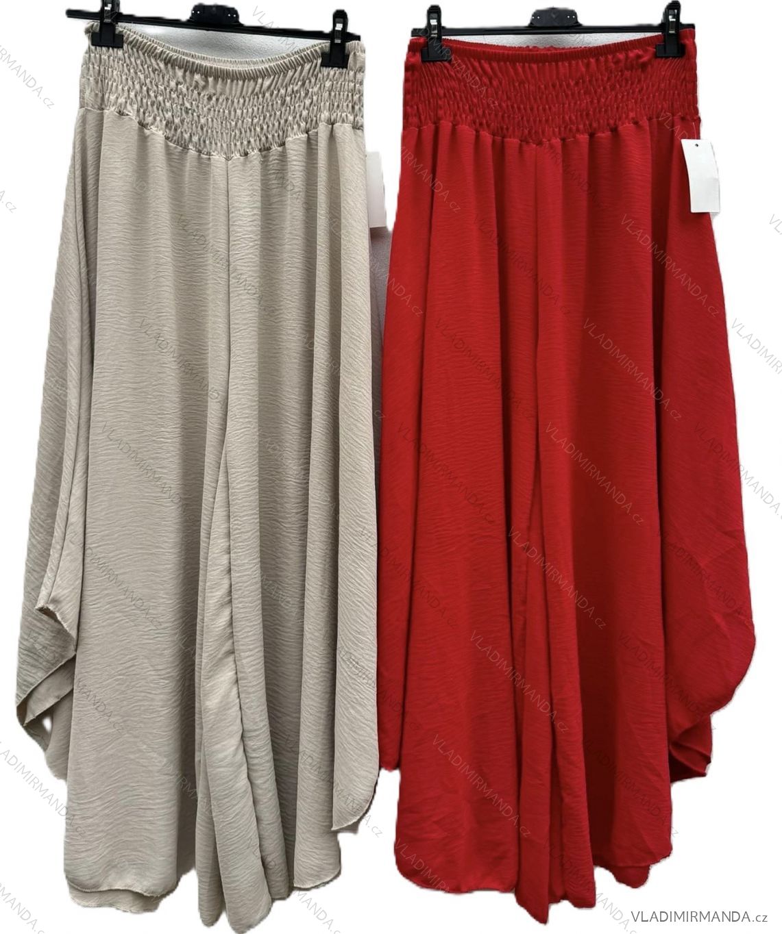 Široký střih kalhot s žabičkováním v pase lichotí postavě a dodává kalhotám sukňový vzhled. Díky tomu jsou kalhoty ideální pro různé příležitosti, od ležérního nošení po letní večírky.